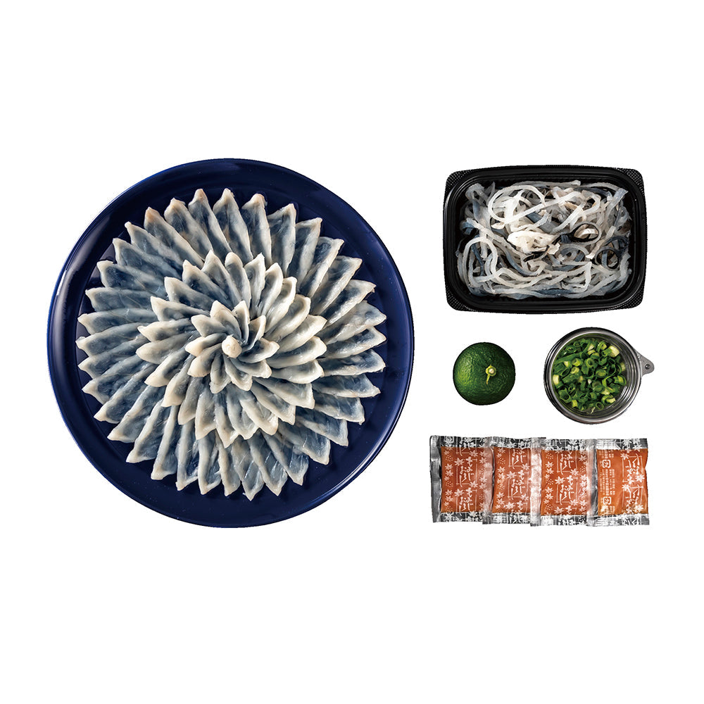 天然とらふぐ刺身90g(27cmプラスチック皿)、とらふぐ皮100g、ふぐポン酢180ml、もみじおろし10g x 4、小ねぎ・柑橘類付