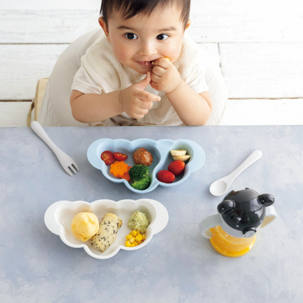 ■お食事が楽しくなるかわいい雲形のプレートは、ごはんをすくいやすい設計で、離乳食のスタートにぴったり。赤ちゃんの手に馴染むカトラリー付きです。8カ月頃から使用できる飲み口が柔らかいストローマグもセットに。