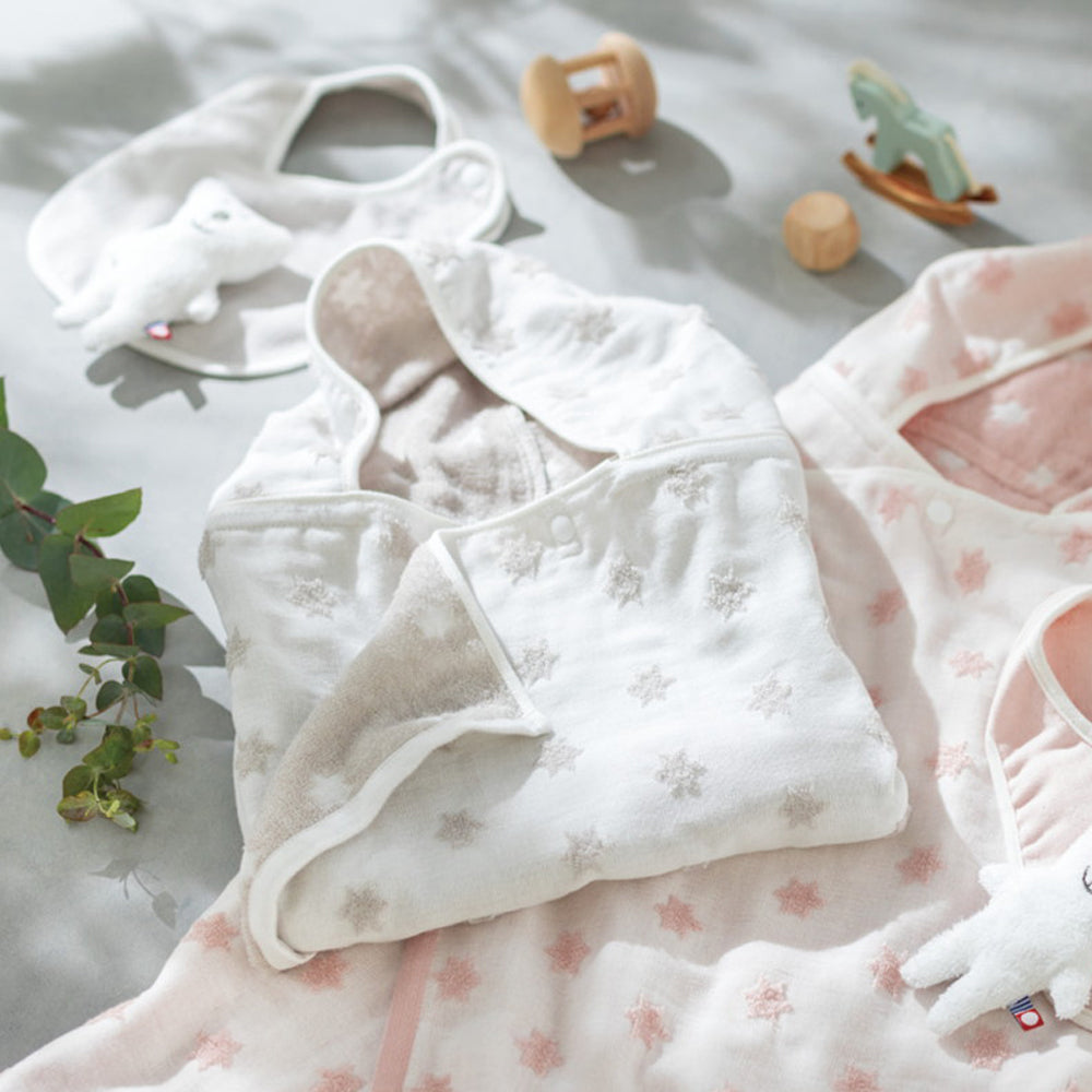■表面はやわらかなガーゼ生地で繊細な赤ちゃんの肌にやさしい風合い。裏面のパイル生地は、吸水性が高く汗や唾液をしっかりふき取りさわやかな使い心地です。