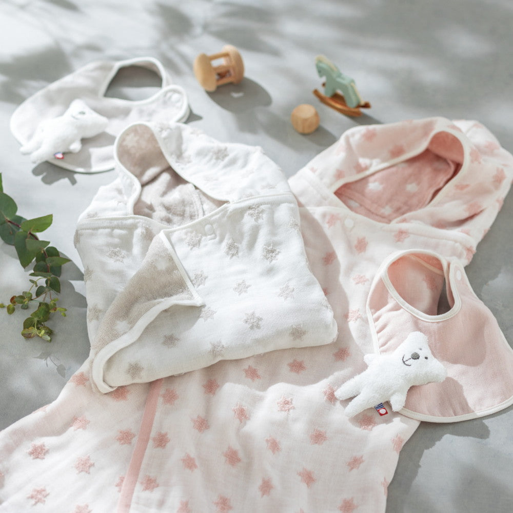 ■表面はやわらかなガーゼ生地で繊細な赤ちゃんの肌にやさしい風合い。裏面のパイル生地は、吸水性が高く汗や唾液をしっかりふき取りさわやかな使い心地です。