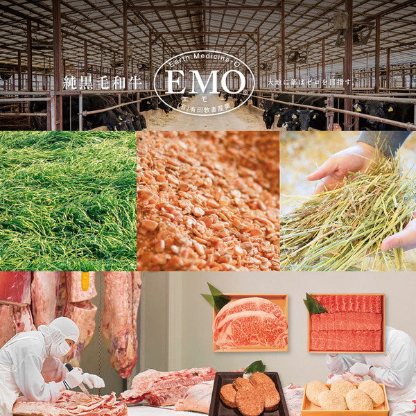 「大地に薬はゼロを目指す」(Earth Medicine 0)の信念のもと、牛にも、エサにも、水にも薬を使わず、丹精込めて育て上げた黒毛和牛です。牛飼い60年以上の知識と経験を十分に活かし、黒毛和牛を約7,000頭肥育しています。適度に日光を浴び、おいしい空気を沢山吸ってストレスフリーな環境で健康な牛が育ちます。また密飼いをせず、1頭1頭しっかり管理を行い仕上げていきます。自社オリジナル配合の飼料を毎日2回お腹いっぱいになるまで与えています。抗生物質は入れておらず人間でも食べられる飼料を与えています。地下80メートルから新鮮できれいな水を汲み上げて牛に与えています。水は内臓にも肉質にも大きく影響しますので常にきれいな水を与えて牛の健康状態を保っています。 ”私たちは健康な牛を育て、健康な牛の肉を食べていただき、健康になって欲しい”というポリシーを常に大切にし、丁寧に肥育しております。(有田牧畜産業HPより)