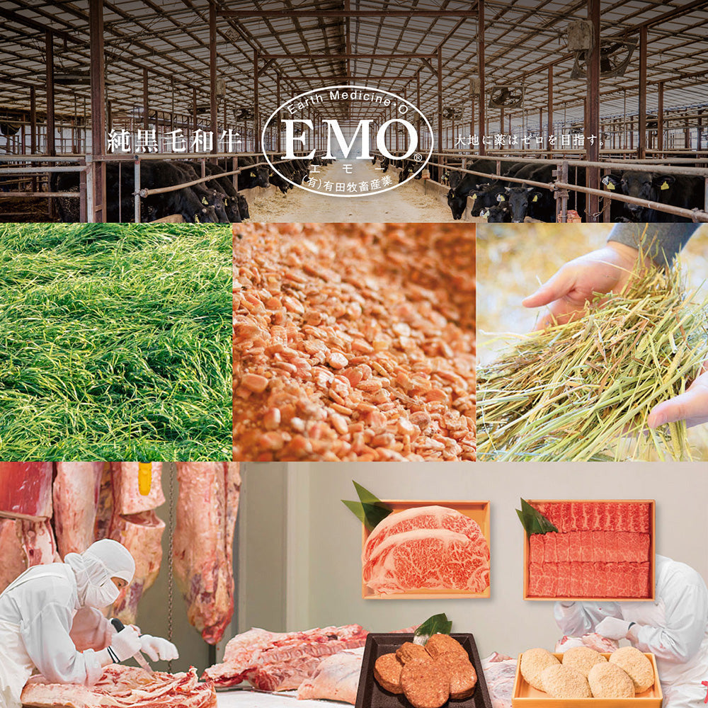 「大地に薬はゼロを目指す」(Earth Medicine 0)の信念のもと、牛にも、エサにも、水にも薬を使わず、丹精込めて育て上げた黒毛和牛です。牛飼い60年以上の知識と経験を十分に活かし、黒毛和牛を約7,000頭肥育しています。適度に日光を浴び、おいしい空気を沢山吸ってストレスフリーな環境で健康な牛が育ちます。また密飼いをせず、1頭1頭しっかり管理を行い仕上げていきます。自社オリジナル配合の飼料を毎日2回お腹いっぱいになるまで与えています。抗生物質は入れておらず人間でも食べられる飼料を与えています。地下82メートルから新鮮できれいな水を汲み上げて牛に与えています。水は内臓にも肉質にも大きく影響しますので常にきれいな水を与えて牛の健康状態を保っています。 ”私たちは健康な牛を育て、健康な牛の肉を食べていただき、健康になって欲しい”というポリシーを常に大切にし、丁寧に肥育しております。(有田牧畜産業HPより)