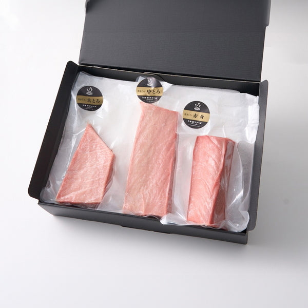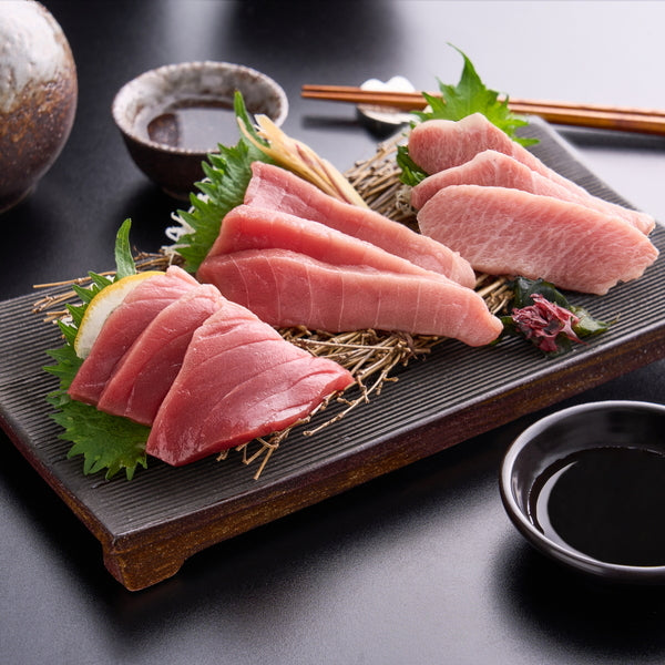 ■寿司ネタや刺身でおなじみのまぐろ。そんなまぐろの中でも人気の高い本まぐろの濃厚な風味を楽しめる赤身、脂の甘みと赤身の旨みのバランスが良い中トロ、濃厚なコクと甘みの大トロの柵をセットにしました。お好みの厚さに切り、醤油でお召し上がりください。