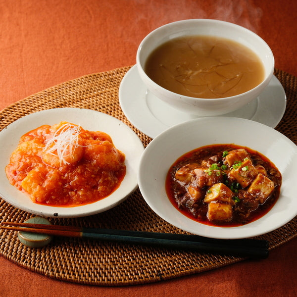■ふかひれの姿煮をはじめ、中華の総菜や食材を専門に扱う老舗「日本橋 古樹軒」から、自慢の総菜3種を。ふかひれの中でもコラーゲンが最も多く含まれている胸びれを使ったふかひれスープは、一滴残らず味わいたい。大きめの海老を使った海老のチリソース煮や、中華料理の定番として人気の高い麻婆豆腐とセットでどうぞ。