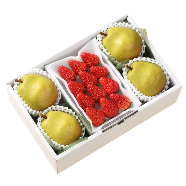 ■商品内容:ラ・フランス4玉(1.1kg)(山形県又は青森県産)、いちご250g(福岡県又は静岡県又は愛知県産)