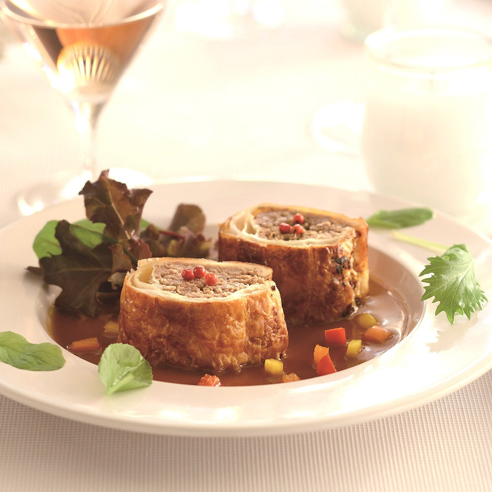 1962年の開業以来、「世界をもてなすホテルオークラ」を合言葉に、日本や世界の賓客をもてなし続けるホテルオークラ。黒毛和牛の存在感とおいしさを最大限に味わえるサクサクした食感のビーフパイ。上品な甘みと香りのあるマデラ酒を使用したソースで召し上がり下さい。記念日やパーティーのシーンなどに最適な一品。