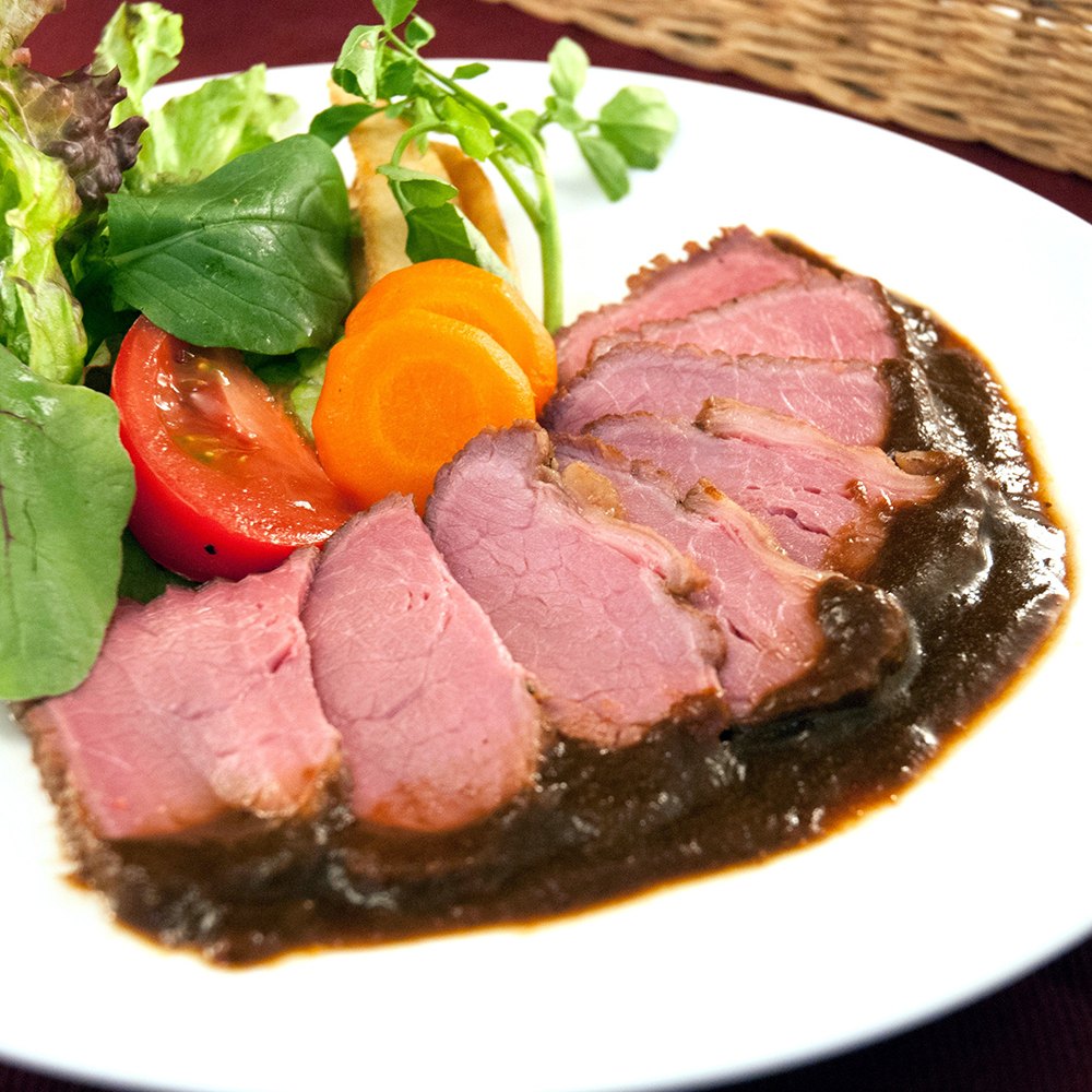 大正12年創業の神戸で生まれた洋食店「伊藤グリル」の味を受け継ぐ姉妹店であり、カジュアルに本格的な洋食が楽しめる「アシエット」。塩、胡椒のみの味付けで、低温で調理したローストビーフは、肉の旨みを逃がさずしっとりジューシーな食感。デミグラスソースをベースにしたアシエットオリジナルソースでお楽しみください。