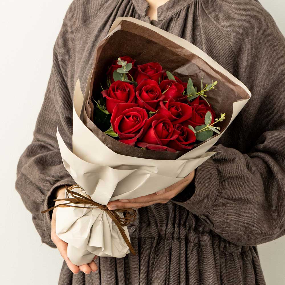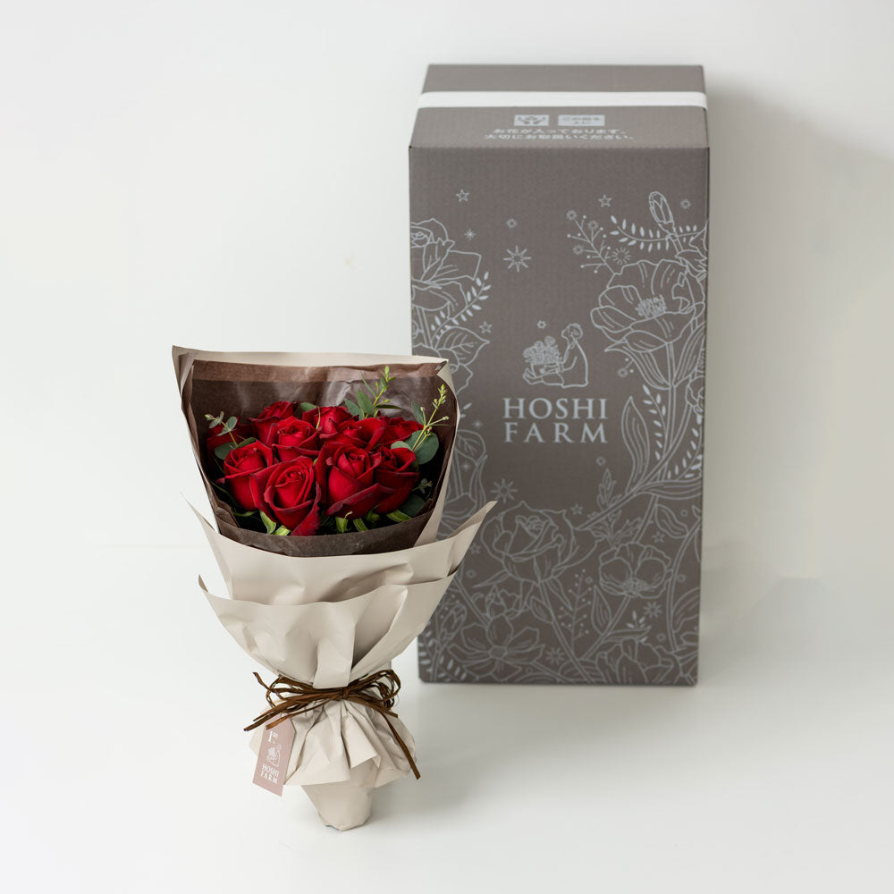 ■赤いバラの花言葉は「愛情」「美」「情熱」「ロマンス」「I love you」などホシファームの赤バラは「サムライ」の1品種にこだわっています。艶やかなベルベットのような深紅の花色と華麗な花形の大輪花が、エレガントで美しい格調高いバラです。花保ちがよいのも魅力のひとつです。12本の赤バラはダズンローズとも言われ、結婚記念日やプロポーズにおすすめ。12本のバラにそれぞれに12個の「感謝・誠実・幸福・信頼・希望・愛情・情熱・真実・尊敬・栄光・努力・永遠」の意味が込められています。この意味をバラに託してパートナーに誓うというのがダズンローズです。二人の特別な日をホシファームのダズンローズで彩ってみてはいかがでしょうか。