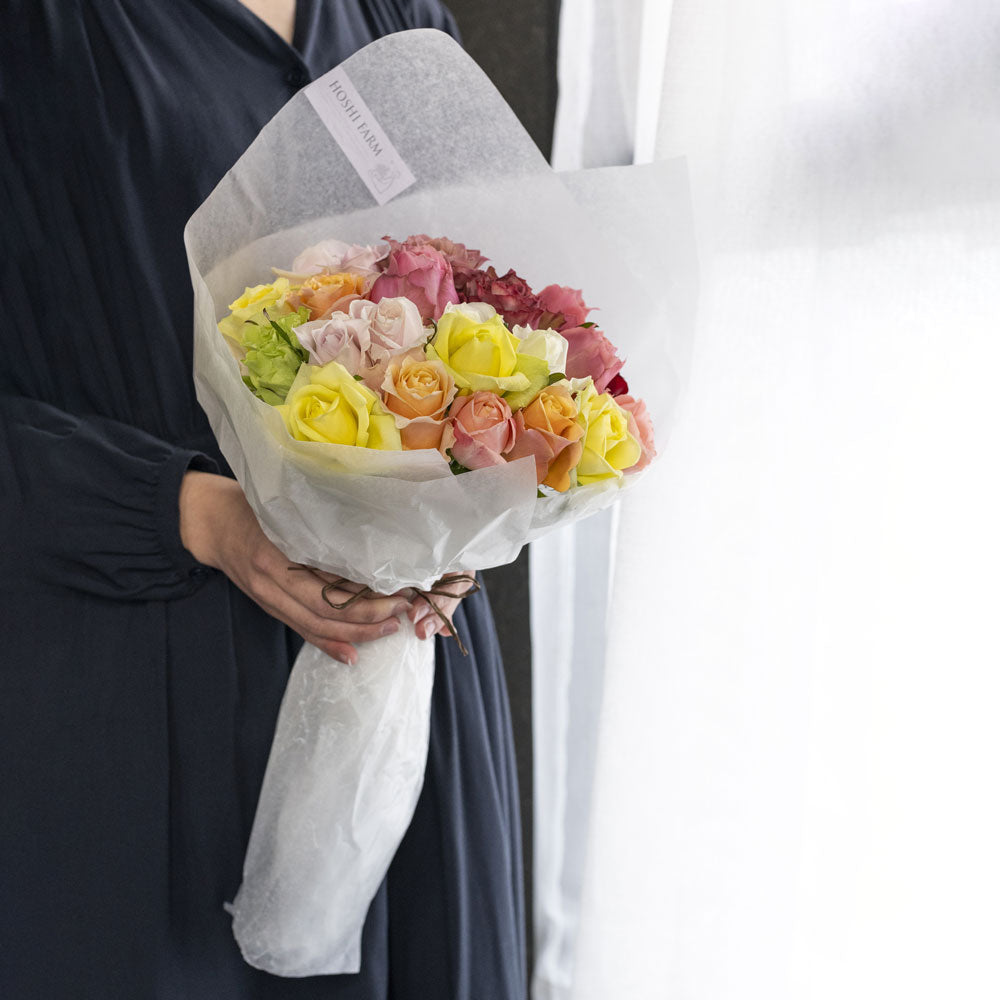■バラ栽培のプロフェッショナルが惜しみない愛情を注ぎ、強く美しいバラへと育てるホシファームのバラ。贈られた花との時間をできるだけ長く楽しんでいただけるよう、花の状態を見極め収穫しています。手元に届いてからふっくらと咲きはじめ、花咲く過程と咲き誇る姿をお楽しみいただけるように、農園から最適なタイミングで直送します。花のある暮らしをお過ごしいただきたい、ご自宅用におすすめのブーケです。