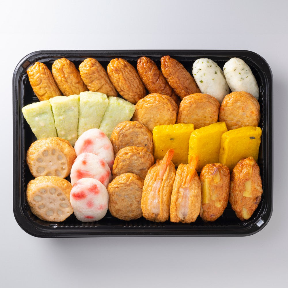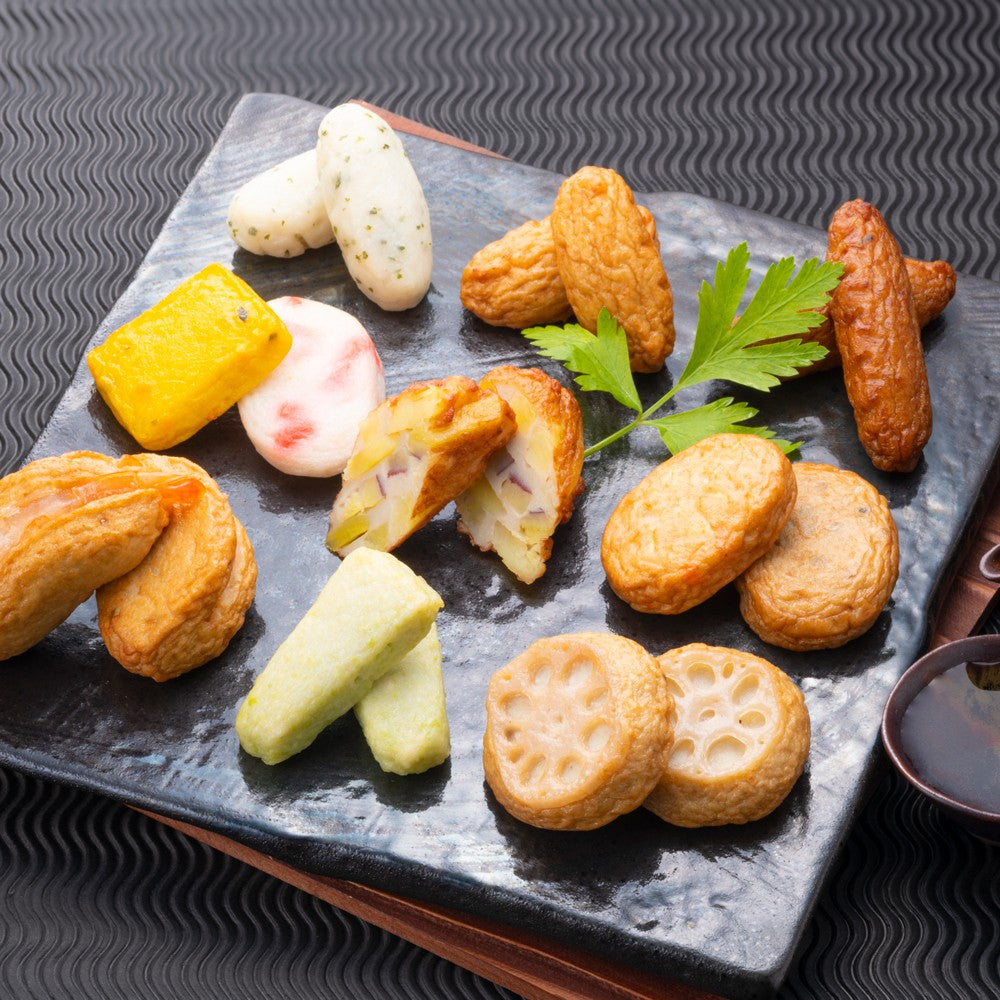 ■魚肉をブレンドし旨みを引き出し、ソフトな食感には豆腐と山芋、風味豊かな甘みに欠かせない灰持酒を使用。小田口屋独自の製造法です。また、練り物に相性の良い色鮮やかな種ものを用い、バラエティ豊かに仕上げました。