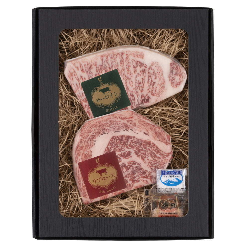 特選千屋牛サーロインステーキ150g、特選千屋牛リブロースステーキ150g、ピンク岩塩・岩塩 各1g