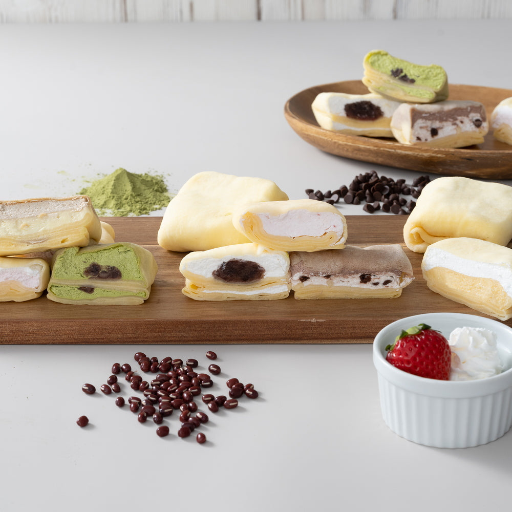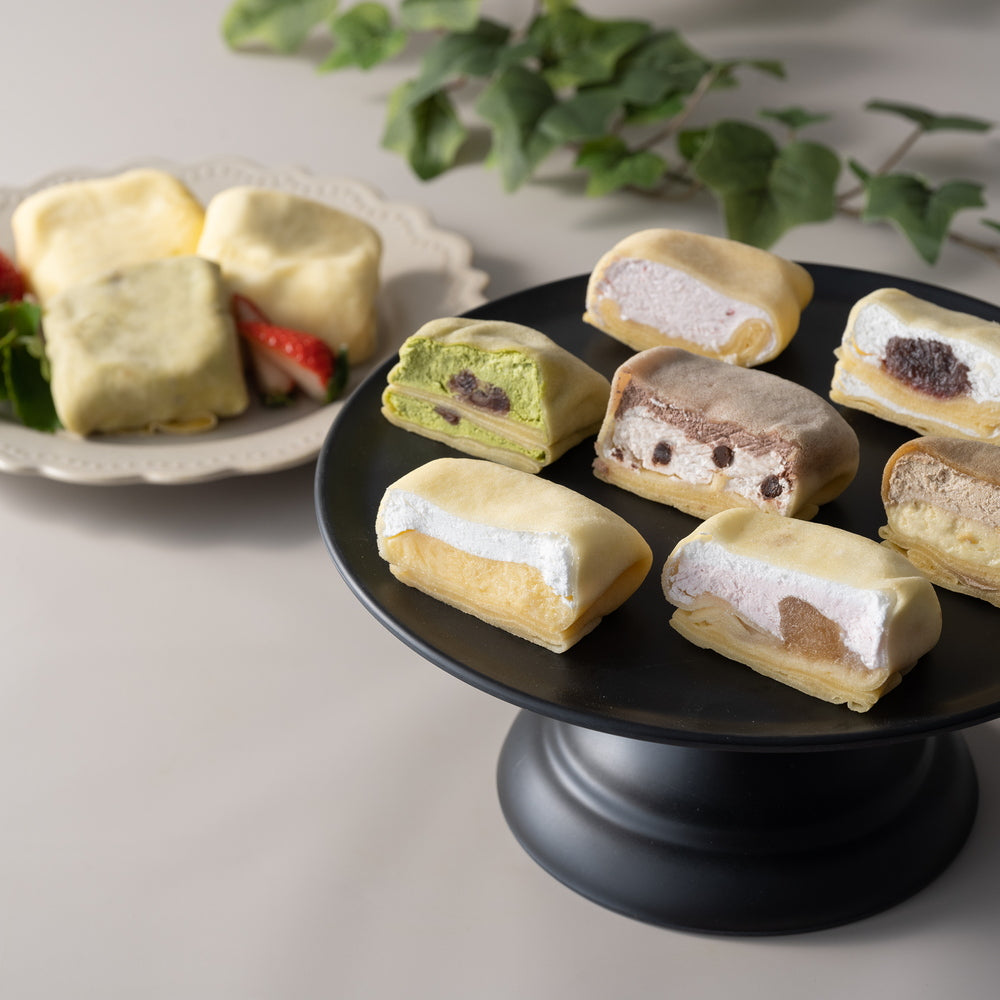 カスタード&ホイップ・抹茶ホイップ&粒あん・ストロベリー&粒あん×各2個、チョコホイップ&チョコチップ・ストロベリー&ホイップ・ティラミス・白いちごクレープ×各1個