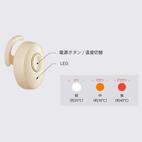 電源ボタンを押すたびに 弱→中→強と温度とLEDの色が切り替わります。約35℃~40℃で心地よい温度で耳の中を温めます。