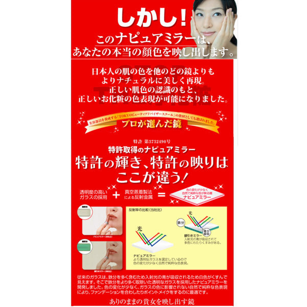 しかし、ナピュアミラーは特許取得の透明度の高いガラスと特殊反射金属加工により、自然でより純粋な色が表現でき、ガラスの色に影響されない正確な色再現により肌本来の色を素直に映し出します。