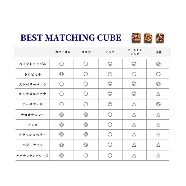 ※各メーカー様倉庫から直送している為、複数商品をご注文の場合でも、メーカー様ごとにそれぞれお届けします。※賞味期限:製造日より18カ月■希望小売価格:7,560円(税込)■商品内容:ドリンクトッピング 種類セット 10種入り (各2個 合計20個)1:カカオオレンジ x 22:クラッシュベリー x 23:バターナッツ x 24:キャラメルバナナ x 25:ベイクドアップル x 26:ストロベリーバニラ x 27:バナナフランボワーズ x 28:チーズケーキ x 29:トロピカル x 2 10:チョコ x 2 ■キューブ状のドリンクトッピング、種類セットです。カカオニブ、ナッツ、ドライフルーツを使用した商品を提案、新しいおいしさをお届けします。 1:カカオオレンジ:ビターなカカオニブとオレンジの相性は抜群。少し大人な味わいを楽しめます。ココア・ミルクとも相性◎ 2:クラッシュベリー:カラフルなスターが可愛い☆カシスとラズベリーの魅惑的なフレーバーです。ココアやカフェオレがおススメです。 3:バターナッツ:マカデミアナッツとバターの芳醇な香りに包まれます。ココアやカフェオレがおススメです。 4:キャラメルバナナ:ドライバナナとブルーベリーをブレンド。キャラメルフレーバーで甘いひと時を。豆乳・ミルクとも相性◎ 5:ベイクドアップル:ドライアップルとクランベリーにカラメルの風味をプラスしました。ココアや豆乳とも相性◎ 6:ストロベリーバニラ:ドライストロベリーとバニラの黄金コンビ。見た目の色も可愛く仕上げました。ココアやアーモンドミルクとの相性も◎ 7:バナナフランボワーズ:期間限定商品。今だけの甘みと酸味の組み合わせを是非お試しください。 8:チーズケーキ:唯一のホワイトキューブ。マスカルポーネの香りと焼きココナッツがポイント! 9:トロピカル:弾けるフルーティーな香り!様々なドライフルーツとピスタチオを使用しています。 10:チョコ:チョコを愛する人にはたまらない。可愛いハートに癒されます <美味しいお召し上がり方> ご用意頂いたホットドリンクに商品1個を入れます。3分程度お待ち頂いた後に、軽く混ぜてからトッピングも一緒にお召し上がりください。 <バランス> GODDESSの商品は専門知識を持つ開発者が、味の設計と調整を行っています。 商品を見た時の色彩、各素材の組み合わせ、飲んだ時の味と食感など全てのバランスを考え自信を持ってつくり出されています。 <品質> 主な原料となっているドライフルーツ、ナッツは世界各国から集めたものを使用しております。 自社の厳しい品質基準をクリアした素材のみを使用し、日本国内自社にて製造・検査を行い、愛情を込めてつくり出されています。 ■CUBE STYLEは私たちの想いを表現しています。飲み物として楽しんで頂けるように固める圧力や乾燥時間など試行錯誤を重ね、CUBE STYLEの商品が実現しました。 私たちの想いがあなたに伝わるように、喜んでいただけるような商品開発をこれからも追及していきます。