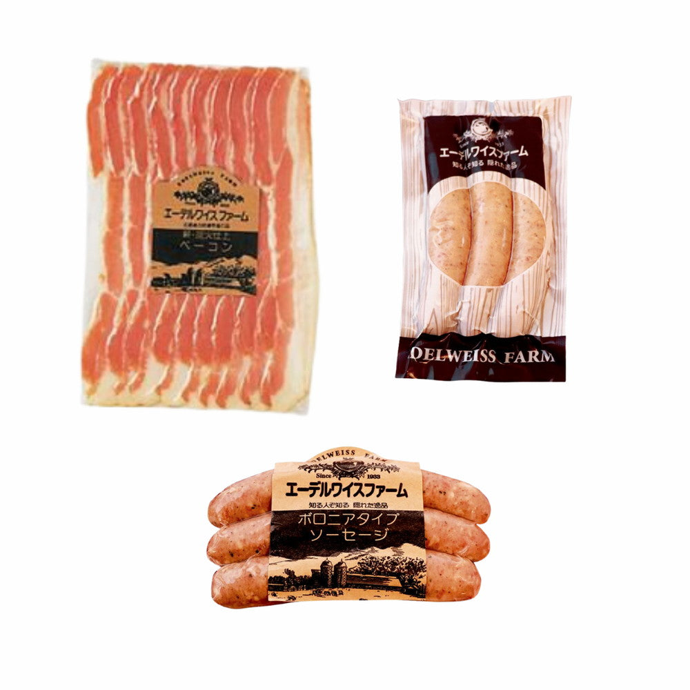 ■商品内容:北海道・誕生90余年 長期氷温熟成製法 「エーデルワイスファーム」薪・炭火仕上げべーコン・ソーセージギフト A