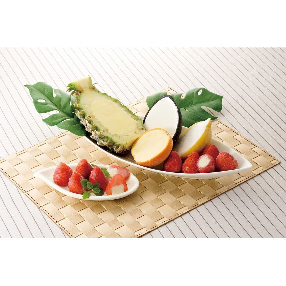 「食べる宝石」と言われる苺をそのままに。新鮮な苺の芯を丁寧にくり抜いて相性抜群の練乳と生クリームを使ったアイスを絞り入れた苺アイスと、パイン・オレンジ・ココナッツ・レモンの果皮を器にした果汁たっぷりシャーベットのセットです。