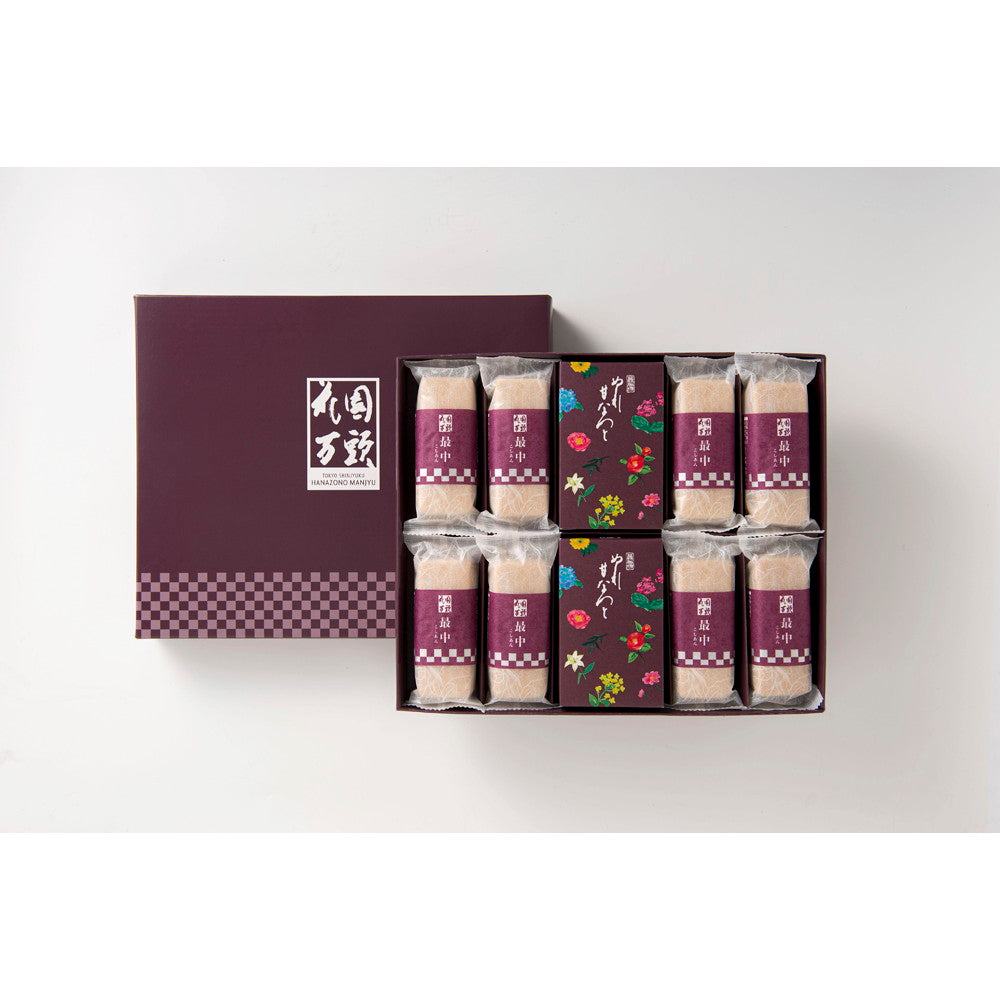 発売以来七十余年の代表銘菓「ぬれ甘なつと」と、花園万頭伝統のえりも小豆を原料に手間暇かけて作ったこし餡で仕上げた「花園最中」とのお詰合せです。