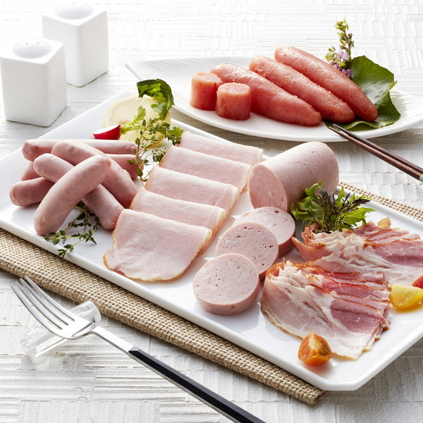 ■商品内容:三田屋総本家スモークロースハム60g、白ウインナー100g、スモークベーコン50g、サルティーチャー130g、辛子明太子200g