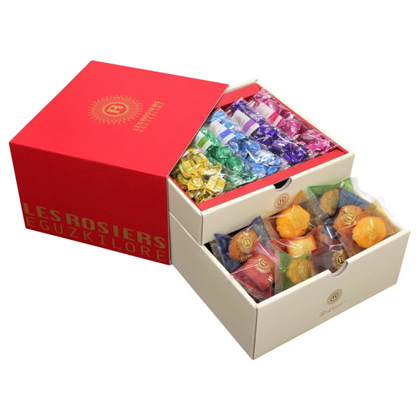 ■引き出しを開けると、ひと口サイズのカラフルなお菓子がたくさん!上の段にはフルーツやティラミスなどの5種類のチョコレート。下の段にはフィナンシェやマドレーヌなどの6種類の焼き菓子が。華やかなギフトボックスに仕上げました。