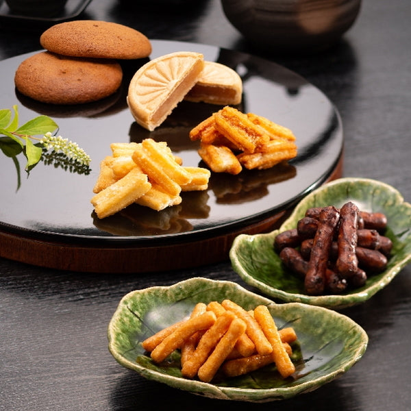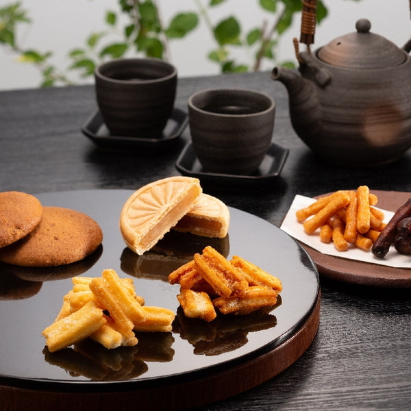 ■銘菓丸ぼうろに、粗く砕いた黒砂糖を練り込んだ黒糖丸ぼうろと、国産玄米から作られた米油100%で揚げたかりんとう。国産のもち米を使用し、米油とごま油をブレンドした油で揚げサクッとした食感の揚げ餅をセットした和菓子詰合せです。