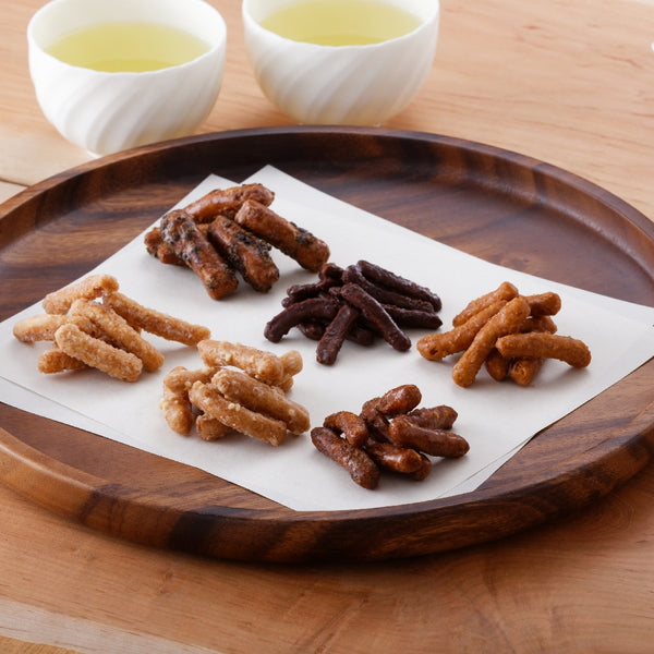 ■サクサクッとした食感に仕上げたハチミツ入り黒糖かりんとう、ピーナッツの香ばしさと甘みが調和したピーナッツかりんとう、牛乳を生地に練り込んだ牛乳かりんとう、香ばしい黒ごまで仕上げた黒ごまかりんとう、チョコレートを生地にたっぷりとねりこみカリっと軽い食感に仕上げたチョコかりんとう、キャラメルをたっぷりとかけしっとりと仕上げたキャラメルかりんとう。6種類のフレーバーを楽しめるかりんとう詰合わせです。