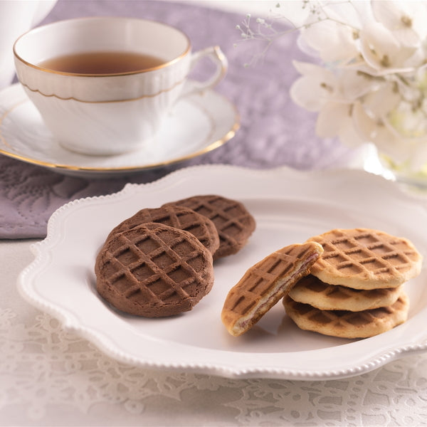 ■サクサク食感のワッフルクッキーにホワイトチョコクリームを詰めた風味豊かなショコラワッフルクッキーとサクサク食感のワッフルクッキーにいちごチョコクリームを詰めたいちごワッフルクッキーの詰合せです。