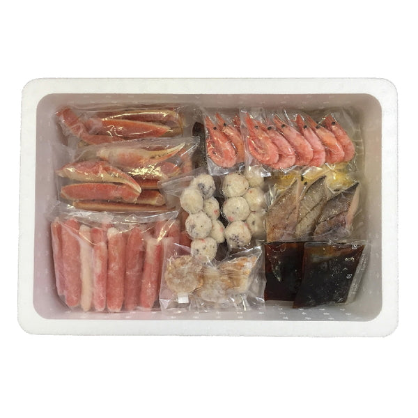 ゆでずわいがにカット400g×3、生ずわいがに棒ポーション400g×1、ボイル海老×24、ボイル帆立×12、かに入つみれ×12、ツボ抜きいか×2、助宗鱈切身40g×6、冷凍生ラーメン×2、たれ(濃縮:醤油仕立て)50ml×6