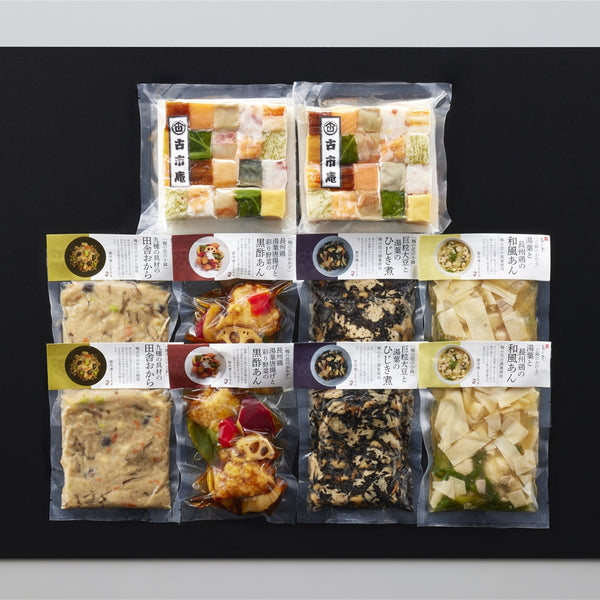 なみはや寿司(鯖、海老、サーモン、穴子、鯛、昆布、カニ、大根酢〆、高菜×各2、玉子×1、玉子焼き×1(ごはん無し))×2、九種の具材の田舎おから煮150g×2、巨粒大豆と湯葉ひじき煮150g×2、湯葉と長州鶏の和風あん150g×2、長州鶏湯葉唐揚げと彩り野菜の黒酢あん150g×2