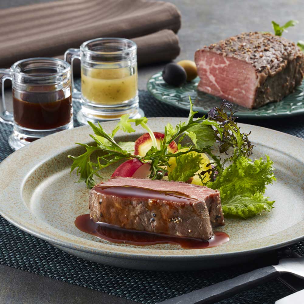 アメリカ産牛肉のモモ部位を使用し、真空調理を行うことにより、素材の風味、旨味を逃さず均一に調理し柔らかい肉質にするため、あえて手間暇をかけて低温で長時間加熱し仕上げました。ソースは、バジルの風味を最大限に引き出し、白ワイン風味やレモンなど爽やかな酸味を効かせ、塩味を効かせビーフコンソメで味を整えた香草ソース(バジル&ソルト)と、濃厚な溜り醤油をベースに、赤ワイン風味、アップルビネガー、チキンエキスを使用しアクセントとしてローレル、クローブ、オニオン、ペッパーなど香辛料を加え味に深みを与えたグレイビーソース(たまり醤油入り)の2種類のソースでお召し上がりいただけます。