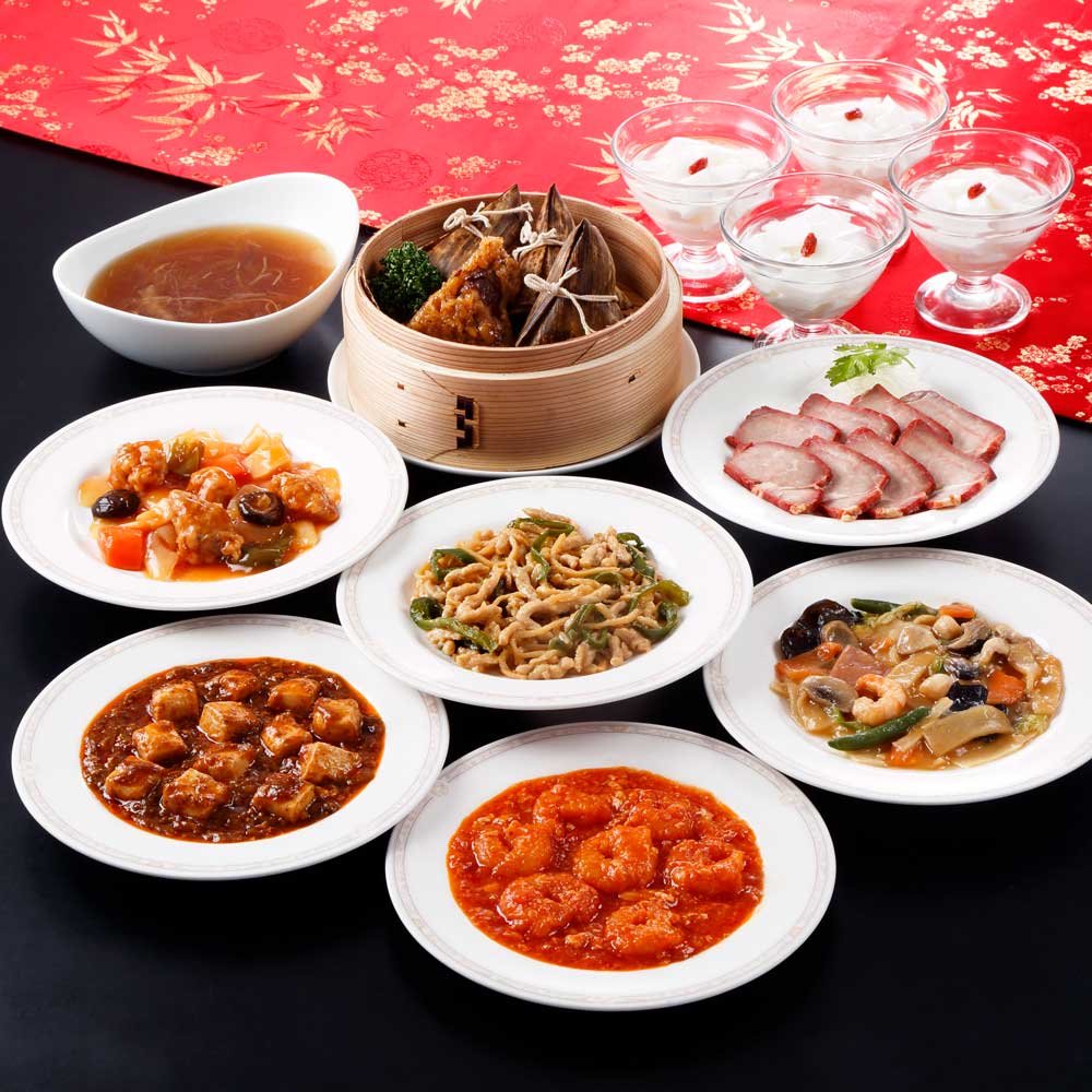■商品内容:乾焼蝦仁150g 、本格四川麻婆豆腐 150g 、本格八宝菜 150g 、青椒肉絲 150g 、酢豚 150g 、焼豚スライス 100g 、角煮入りちまき( 4 個) 240g 、魚翅湯(ふかひれ入りスープ) 250g 、杏仁豆腐 500g 各 1P