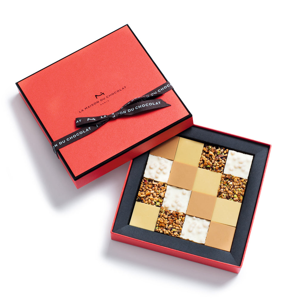 ペカン ブロンディネ、キャヴァル フリュイ セック、パッション ヴィブラント、ブラン フリソナンの4種のタブレットを正方形にカットしボックスに詰合せました。