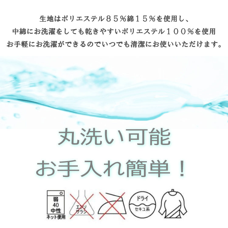 生地はポリエステル85%綿15%を使用し、中綿にお洗濯をしても乾きやすいポリエステル100%を使用