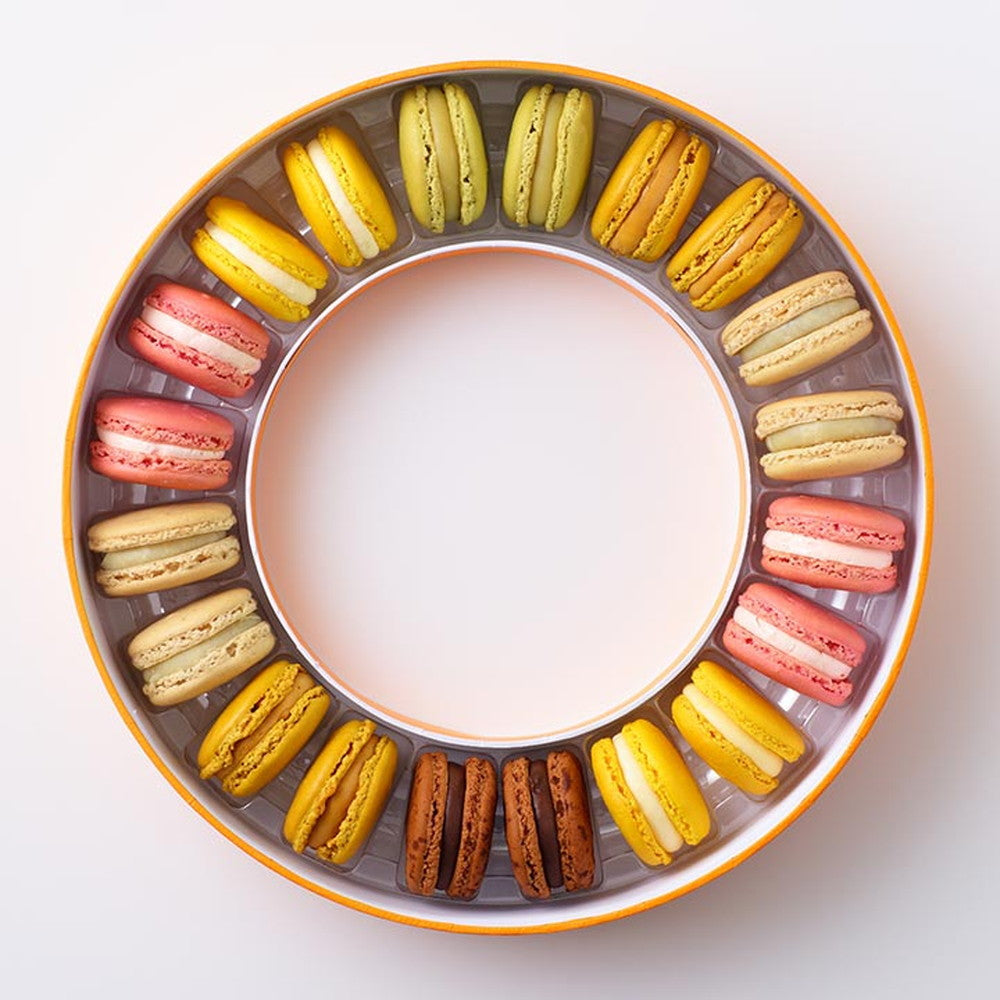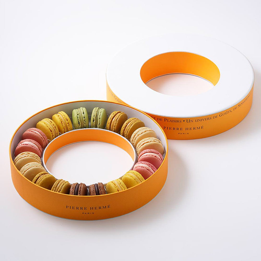 ピエール・エルメ・パリの代表アイテム、マカロン。斬新なリング型のマカロンボックスに人気の高い定番フレーバー6種を詰め合わせた20個入りギフトボックスです。どなたにも喜ばれる定番の詰め合わせ内容は、贈り物や手土産などのギフトとしても最適です。