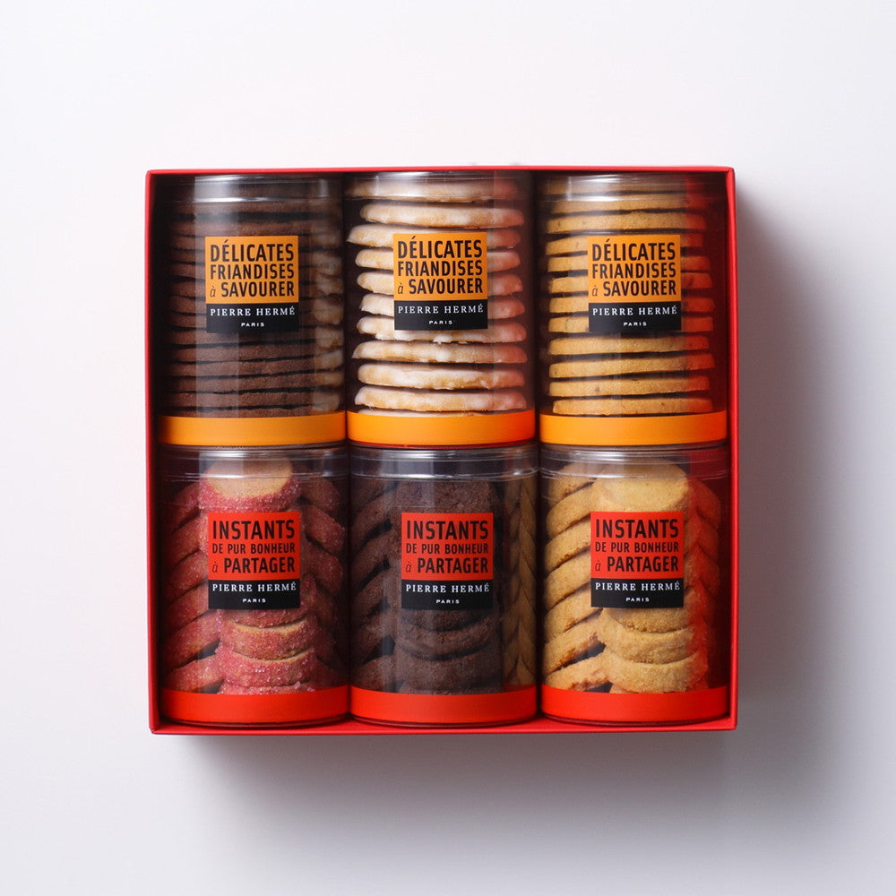 ピエール・エルメ・パリ定番人気を誇る「サブレ アンフィニマンショコラ」、「サブレ アンフィニマン ヴァニーユ」の他、季節のサブレ4種を含む合計6点をオリジナルの赤のギフトボックス小に詰め合せました。