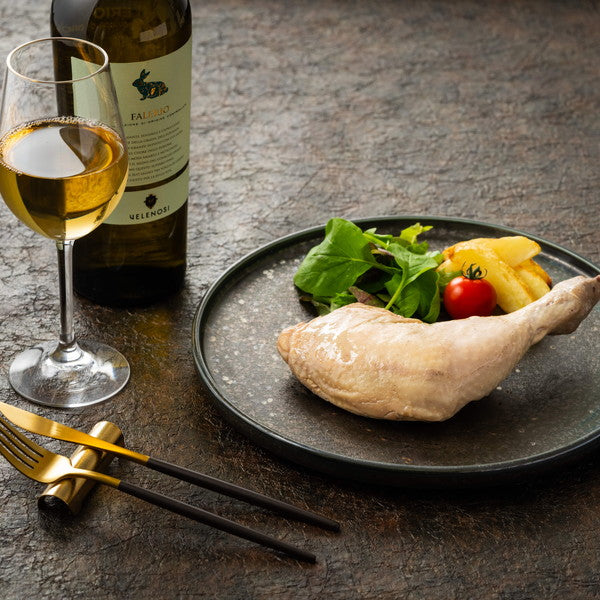 ■低温でじっくりと火を通した、しっとりやわらかジューシーな骨付き鶏肉もものコンフィ。素材の旨みをぎゅっと閉じ込め、一口食べれば鶏の旨みとハーブの香りがふわっと広がり、食欲をそそります。湯煎で温めるだけで、本格フレンチの一品がご家庭で手軽に味わえます。付け合わせにマッシュポテトや温野菜を添えれば、さらに豪華なディナーに。ワインとの相性も抜群で、特別な日の食卓を彩ります。