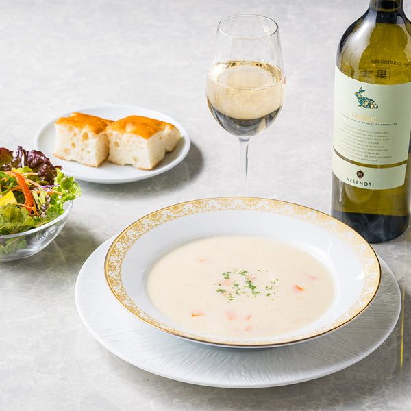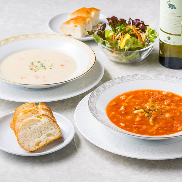 アサリの風味が香るクリーミーなクリームスープは、 生クリームを加えた牛乳で、 たまねぎ、 じゃがいも、にんじんを煮込んだ、野菜や牛乳の味わいがギュッとつまったお味。