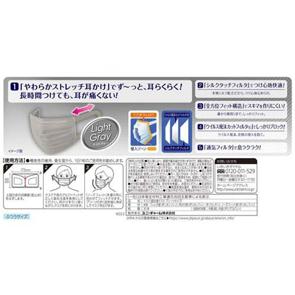 ■希望小売価格:オープン価格■商品内容:超快適 マスクプリーツタイプ グレー ふつう 4個(1個30枚入) ■【超快適マスク プリーツタイプ グレー ふつうの商品詳細】 ●やわらかストレッチ耳かけで、ず~っと、耳らくらく! ●長時間でも耳が痛くなりにくい。更に、本物シルク配合で、つけ心地なめらか! ●ウイルス飛沫カットフィルタRで、空気中のウイルス飛沫・花粉の侵入をしっかりブロックします。 ●PM2.5にも。 ■【使用方法】 ・機能性の維持、衛生面から、1日1枚のご使用をお勧めします。 1.仮止めをはずします。 2.マスク下部のアルファベットが正しく読める面を表側にしてください。耳かけを引っ張りながら、マスクを耳にかけます。 3.「ノーズフィット」を鼻の形に合わせてフィットさせます。プリーツの折り目を縦に伸ばしてマスクを広げます。 【規格概要】 素材:本体・フィルタ部(ポリオレフィン)、耳かけ部(ポリオレフィン・ポリウレタン)、ノーズフィット部(ポリオレフィン) 包装材の材質:外箱(紙)、内袋(ポリプロピレン) 【注意事項】 ・個人差により、眼鏡が曇る場合がありますので、運転の際などは十分にご注意ください。 ・本品は使いきり商品です。洗濯による再使用はできません。 ・耳かけを引っ張りすぎると、ゆるくなることがあります。 ・本品は有害な粉塵やガス等の発生する場所でのご使用はできません。 ・肌に異常がある場合は、使用しないでください。 ・万一、肌にかゆみ・かぶれ・しめつけや擦れによる異常があらわれた場合は、直ちにご使用をやめ、医師にご相談ください。 ・万一、臭いにより気分が悪くなった場合は、ご使用をおやめください。 ・お子様の睡眠時のご使用は、安全性を考慮し、お控えください。 ・乳幼児の手の届かない所に保管してください。 ・高温多湿な場所、直射日光の当たる場所での保管は避けてください。 ・火気のそばでのご使用はおやめください。 ■【原産国】 日本