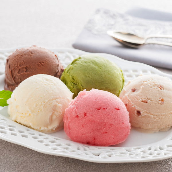 ■素材の味が引き立つよう作りあげたなめらかな口どけのアイス。定番のバニラの他に、シェフおすすめのプラリネなど5種類のフレーバーをセットにしました。