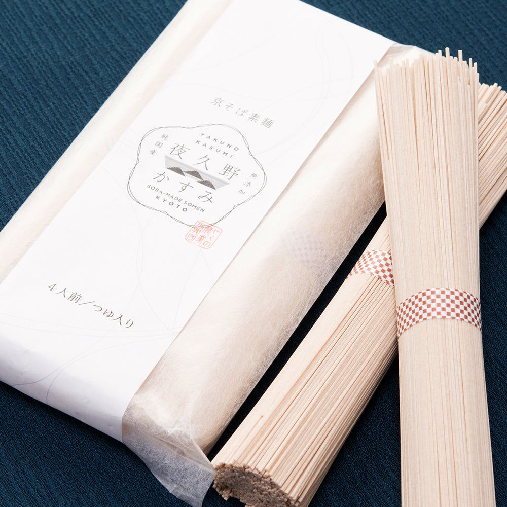 【京そば素麺 夜久野かすみ】良質な京都府産のそば粉、国産小麦粉、塩のみで製麺した、純国産、無添加の1.2㎜極細麺です。なめらかでのど越しが良く蕎麦の香りも楽しめる、新しい麺になっております。