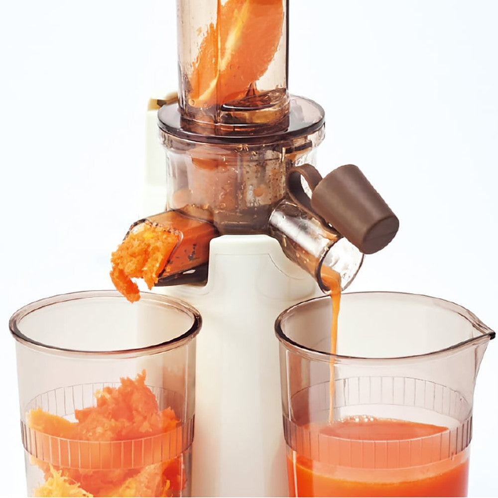 ■食材に熱や水分を加えず、じっくり丁寧に“自然の恵み100%のジュース”だけを搾り出す[コールドプレスジューサー ミニ]。素材の栄養はそのままに、繊維質や種、皮などはしっかり取り除くため、手軽にサラッとした口当たりなめらかなジュースが楽しめます。圧縮製法だからジュース自体が酸化しにくく色もキレイ。搾りかす(食物繊維)は調理にも応用できます。