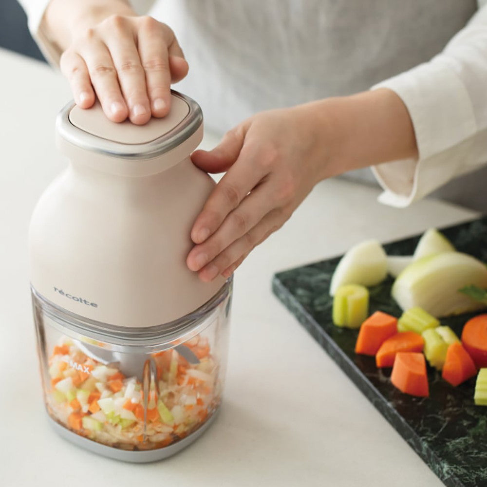使い方は、食材をカップに入れてプッシュするだけ! シンプルな設計で誰でも使いやすく、お手入れも簡単です。