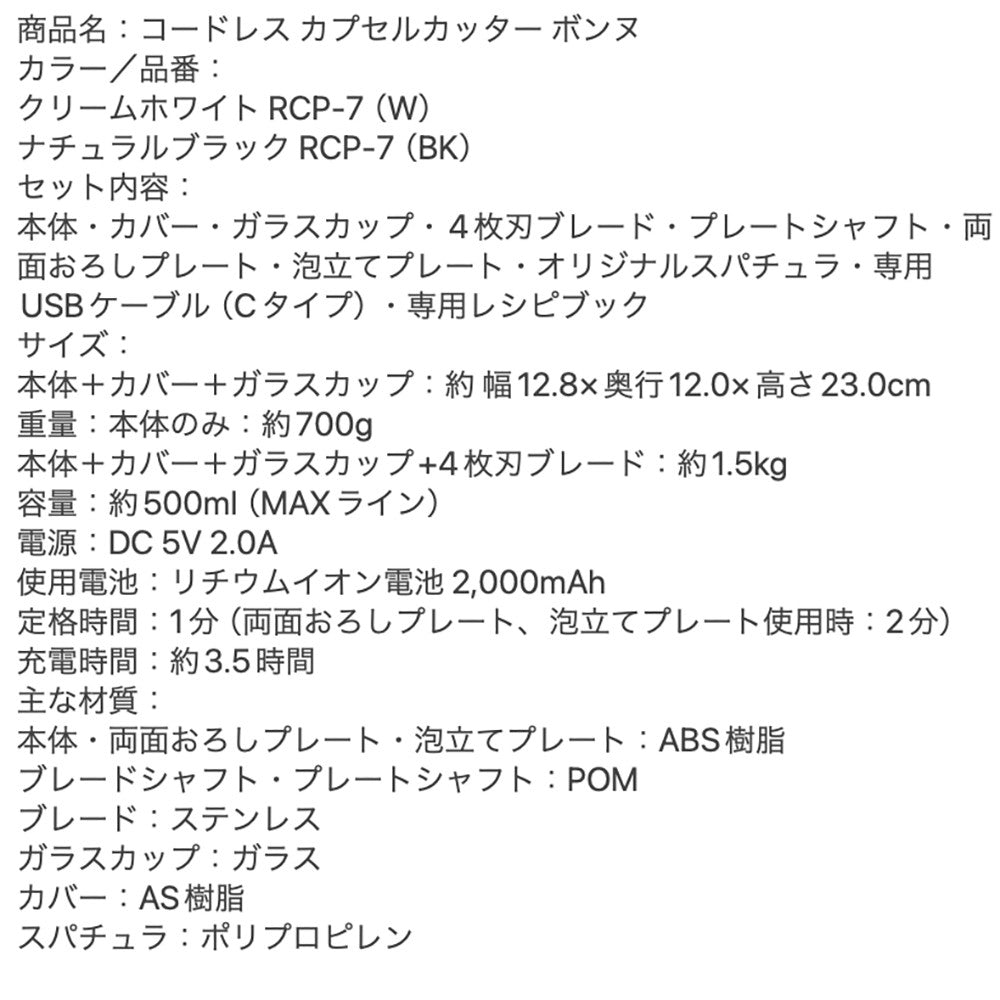 ■商品内容:レコルト コードレス カプセルカッターボンヌ ナチュラルブラック