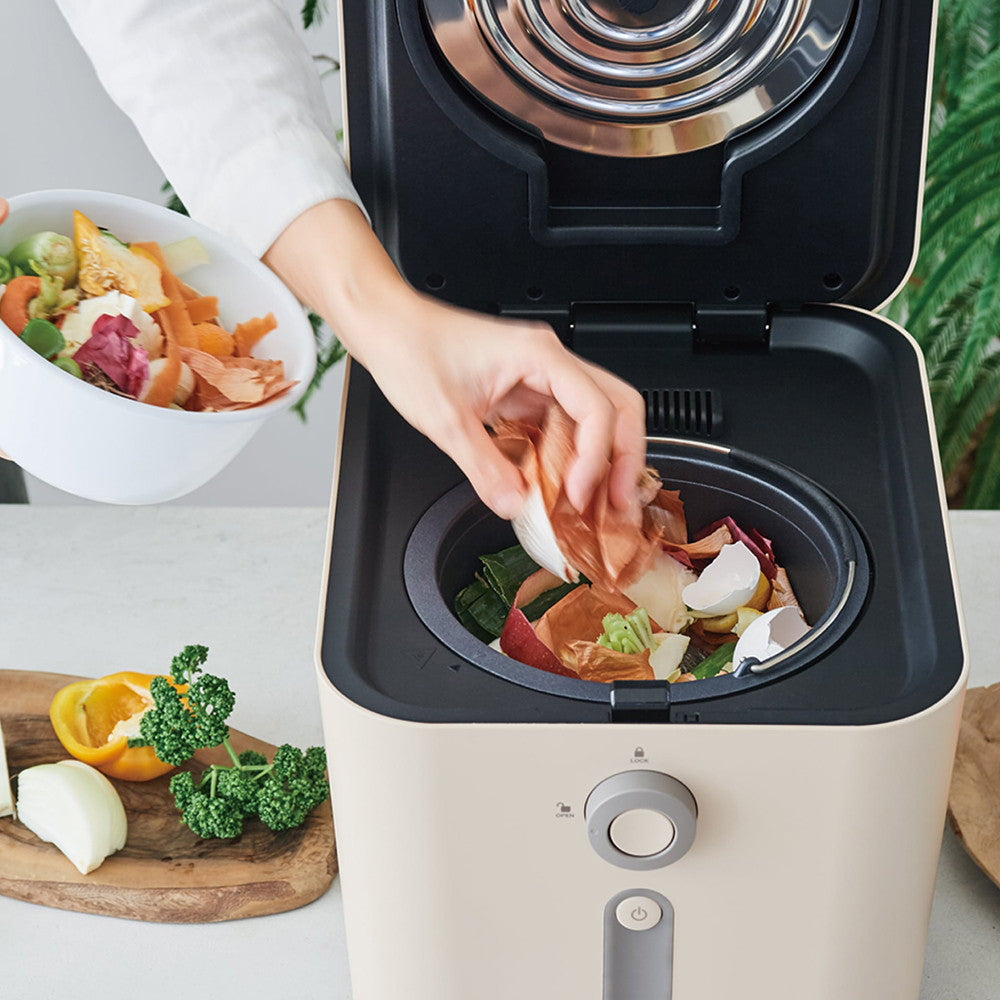 生ごみのおよそ8割を占めるとされる水分を「乾燥」によってとばし、複数の羽根で生ごみを撹拌して砕き、軽くするから、ごみ出しもラクラク。乾燥処理後のごみは、土と混ぜて数カ月熟成させることで肥料としても使えます。