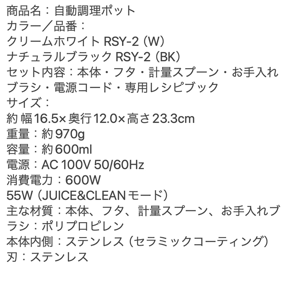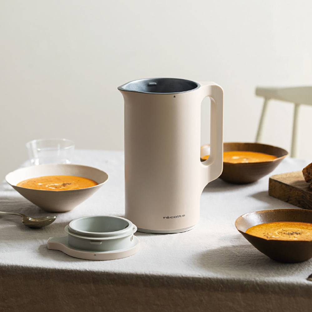 “ほったらかし”でお料理完成!スリムなポット型の自動調理器。材料の刻み具合や加熱温度を、5種類の調理モードごとにコントロールしながら撹拌。なめらかなポタージュや具材の形を残した食べるスープ、おかゆ、豆乳など、手間なく簡単に作れます。家庭用の氷も砕くことができるので、スムージーなどの冷たいメニューもOK!保温できるモードも搭載。容量約600ml。
