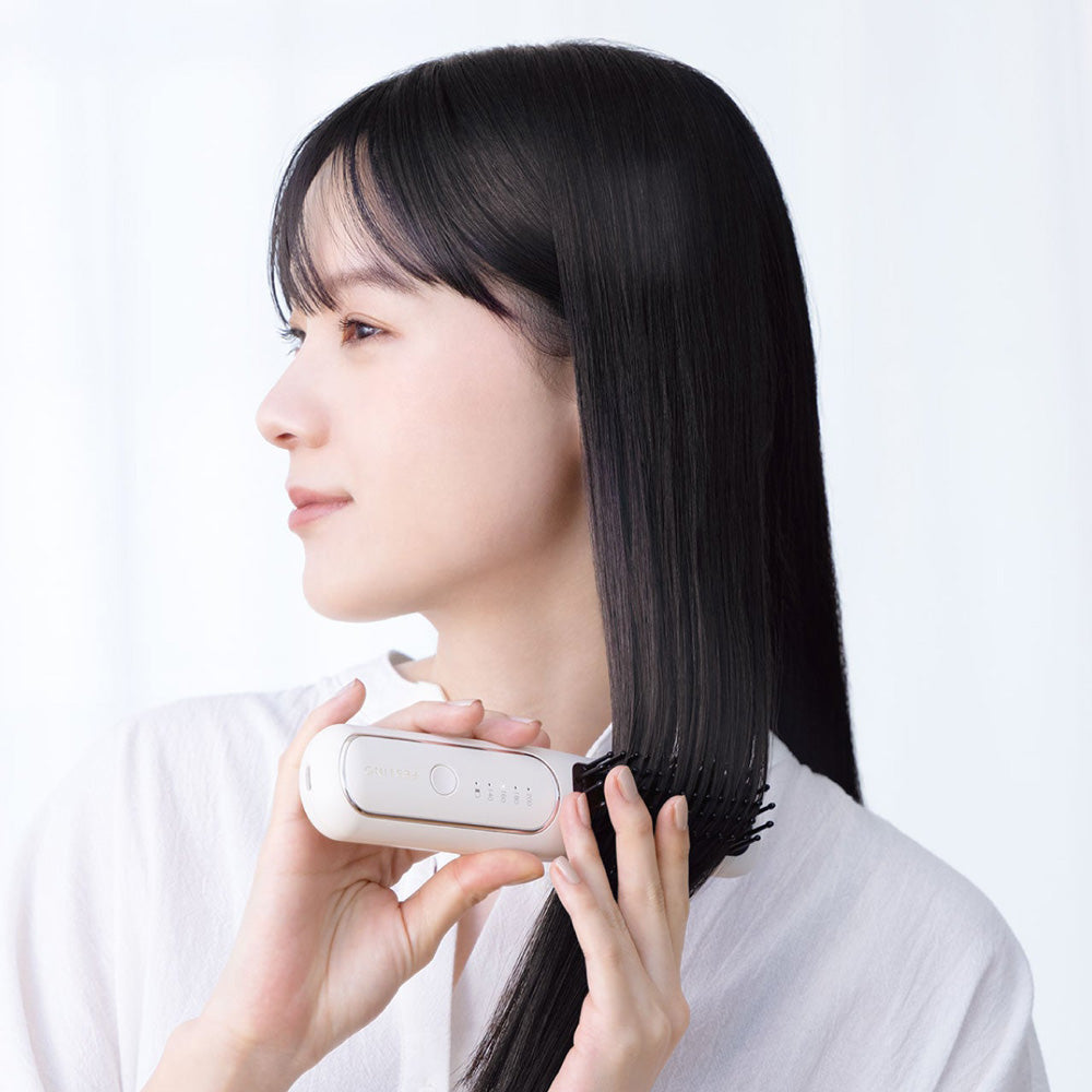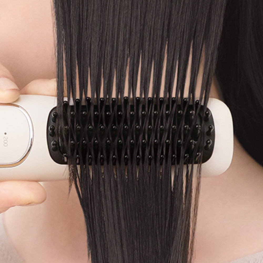 使用中、マイナスイオンが連続で発生。パサつきや静電気を抑え、とかすたびにしっとりまとまるしなやかな髪へ。ブラシの両側に吹き出し口があるので、髪にまんべんなく行き渡ります。
