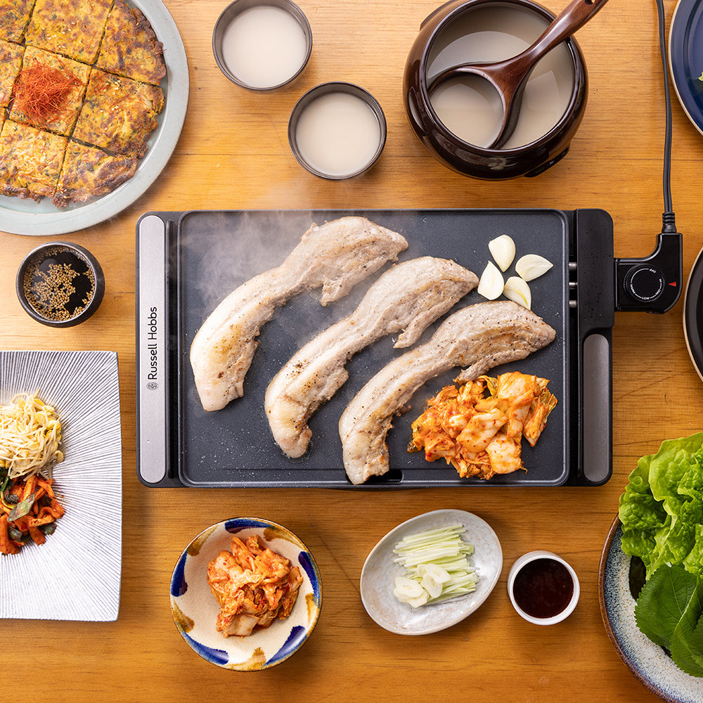 朝はマフィンのベーコンサンドとスクランブルエッグ、お昼はピザや揚げ物の温め直し、夜は焼肉やチーズフォンデュと、ひとり暮らしの方や忙しいカップルでも、ベーシックホットプレートが1台あれば、自宅での調理が手軽になります。